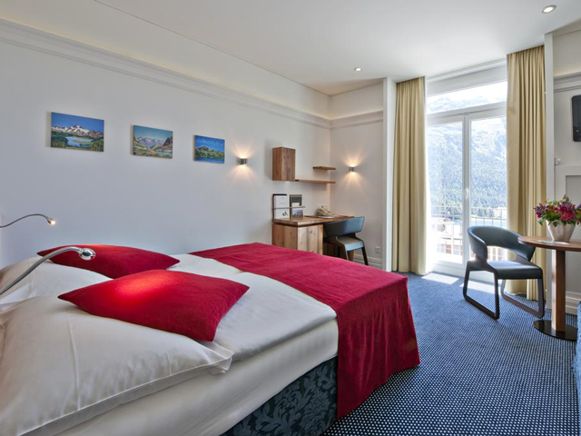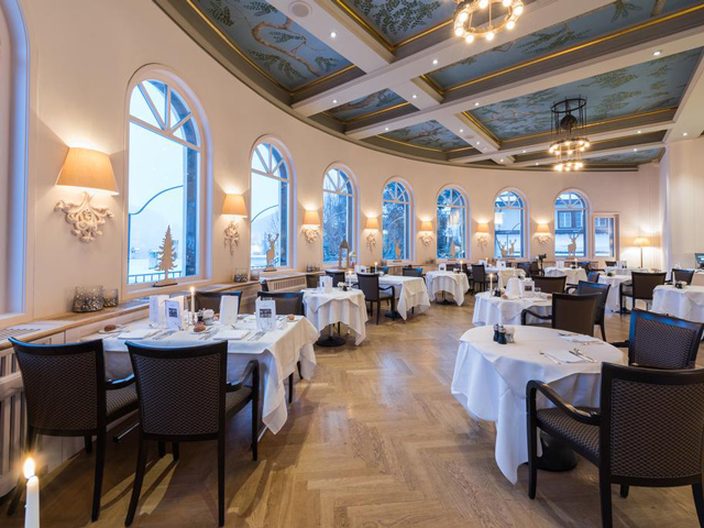 サンモリッツ湖を見下ろす小高い丘の上に立つホテルです。白を基調とした重厚感のある外観が印象的です。お部屋はシックに落ち着いた内装でまとめられています。最上階のテラスからは周囲の山々と湖の美しい景色をお楽しみいただけます。