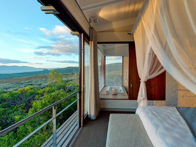 ケープ半島と大西洋の絶景を望む高台に位置する「ナショナルジオグラフィック社」が選ぶ“世界の最もユニークなロッジ”の1つに選ばれた数々の受賞歴をもつこだわりのロッジを厳選しました。グルートボス私営自然保護区のオーナーがフラワーウォッチングのためにこだわって建てたフィンボスの花々に囲まれたラグジュアリーロッジです。各お部屋は1棟ずつ独立型のコテージになっており、暖炉のあるリビングエリアとプライベートテラスを備えた広さ約85㎡のスイートタイプとなります。お部屋から眺めるケープ半島に沈む夕日は格別の光景です。