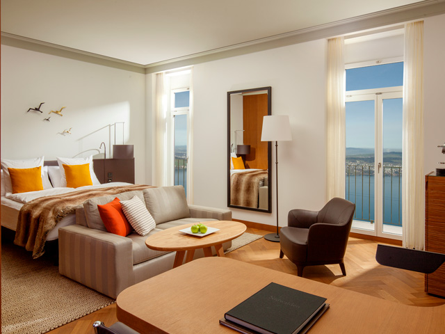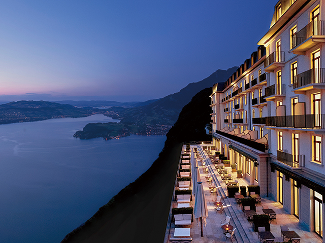 ルツェルン湖を見下ろすように佇むデラックスホテル。ホテルからはきらめくルツェルン湖と遠くにそびえるアルプスの絶景をご覧いただけます。優雅な滞在をお楽しみください。