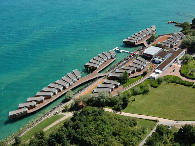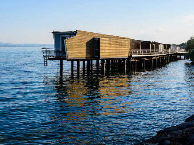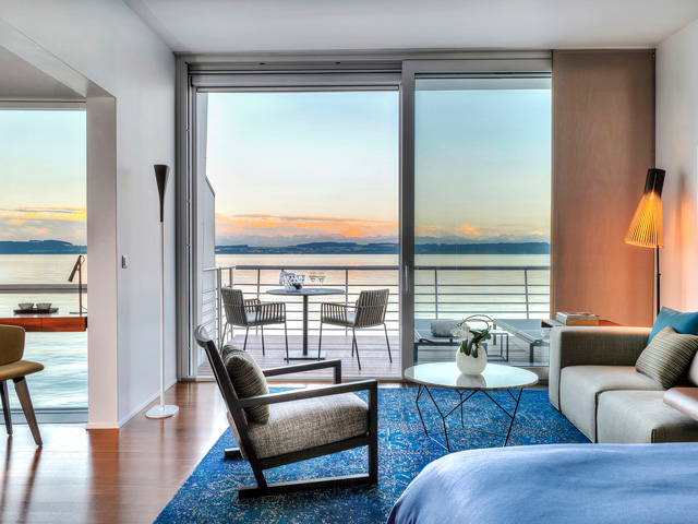 ヌーシャテル湖とアルプスの山を見渡す独立型のユニークなデザインの隠れ家リゾート。お部屋は湖面に浮かぶ水上タイプと湖を見渡す陸側の2タイプよりお選びいただけます。 (写真はすべて©hotel Palafitte)