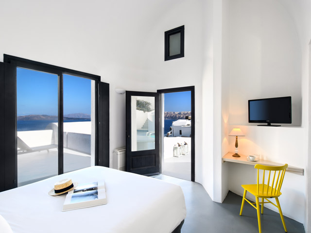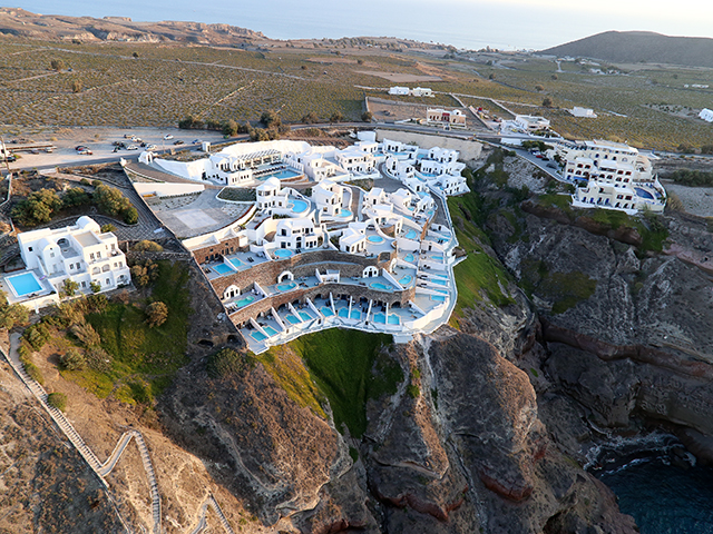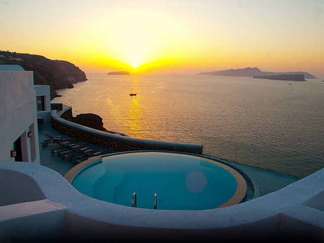 エーゲ海と火山のパノラマが一望できるギリシャらしい白壁にモダンな内装のデラックスリゾートです。各お部屋にはプライベートプールが付いていて、プールサイドからカルデラの眺めを心ゆくまで堪能できます。ホテルは断崖絶壁に張り付くように立ち、まるでエーゲ海とホテルが一体化しているかのようなホテルです。