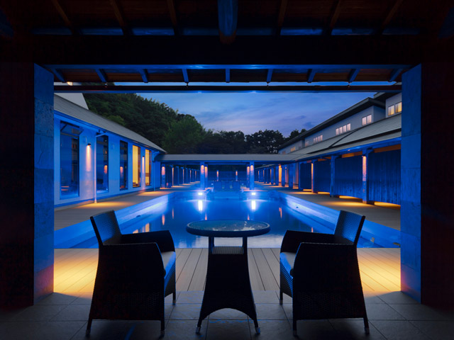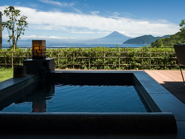 客室はわずか8室のみ。すべての部屋に露天風呂が付いており、天気の良い日には露天風呂に浸かって海越しに富士山を眺めることができます。「富岳」は富士山、「群青」は青い海を表します。その絶景が名前の由来となっている温泉宿でお寛ぎください。