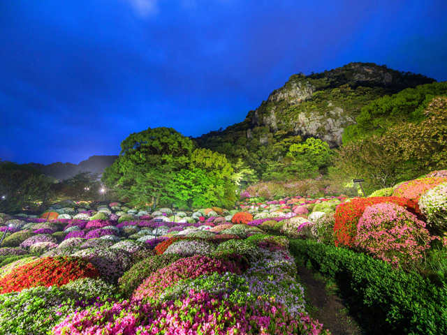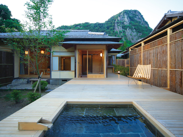 御船山の麓に造られた約15万坪の庭園「御船山楽園」では、4月中旬になると、つつじなど春の花が見頃を迎えます。その敷地にひっそりと佇む「御宿 竹林亭」は、かつて皇族の方々もご滞在された名旅館。全室露天風呂付きでゆっくりとおくつろぎいただけます。また、宿泊客は専用の入口で御船山楽園にアクセスでき、夜のライトアップや朝の散策などゆったりとしたひとときをお楽しみいただけます。