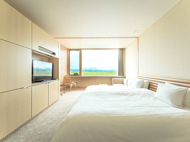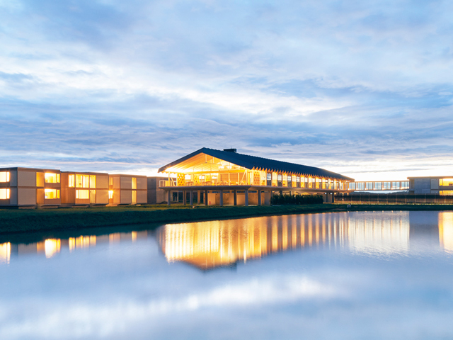 出羽三山から日本海へ豊かな自然が広がる庄内平野の田んぼの上に浮かぶように立つホテル。“晴耕雨読の時を過ごす”をコンセプトに、世界的に数多くの建築を手掛ける坂茂氏の設計で木のぬくもりを生かしたシンプルで居心地のよい空間が広がっています。