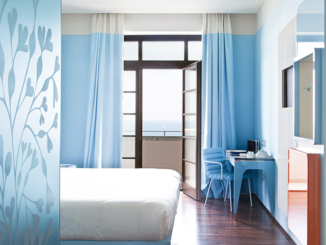 アドリア海沿いに位置し、ホテルの上層部にあるテラスからは海の景色をお楽しみいただけます。室内はライトブルーを取り入れたマリンスタイルのホテルです。