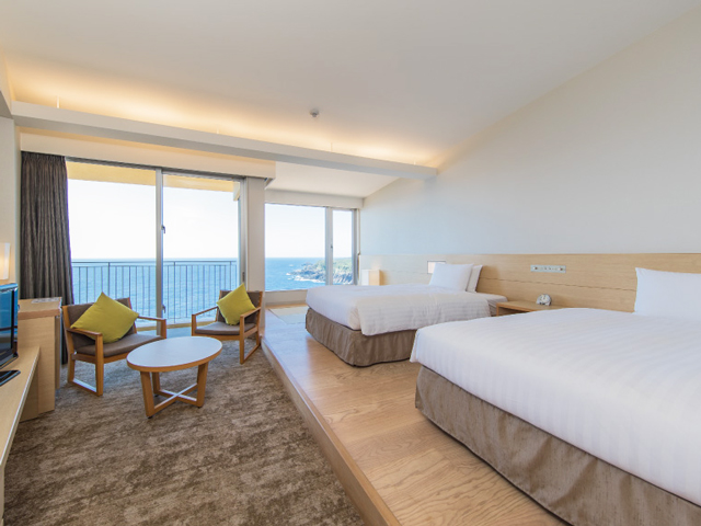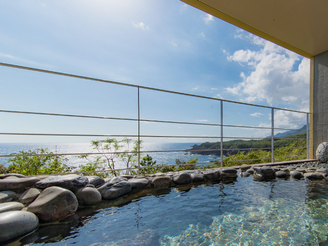 く大海原が広がります。海側のお部屋からは遥か彼方までつづく水平線を、山側のお部屋からは、世界自然遺産に指定された屋久島の雄大な山々の景色をお楽しみいただけます。大海原を一望する大浴場と露天風呂ではとろみのある泉質の屋久島温泉をご堪能ください。