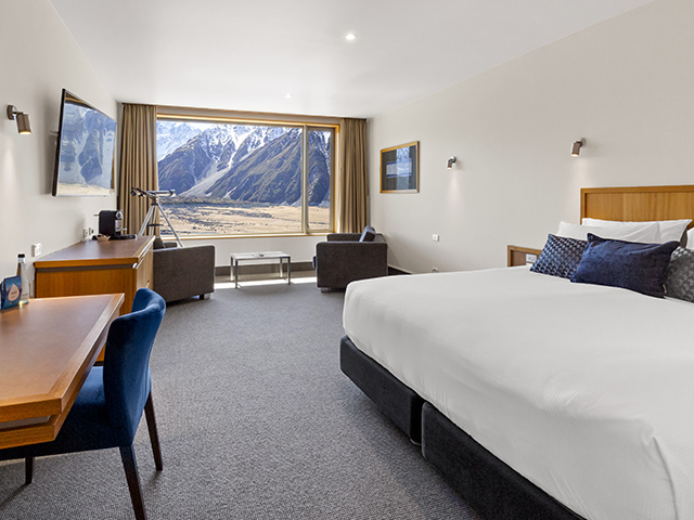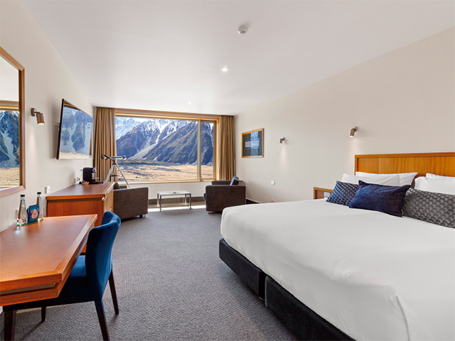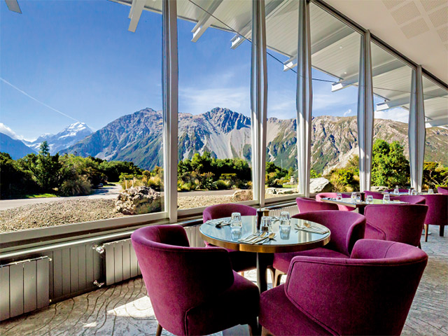 名峰マウント・クックを始めとした山々の景色をお楽しみいただける、国立公園内の山岳リゾートホテルに2連泊し、大自然をゆっくりとお楽しみいただきます。レストランやお部屋からは山々の雄大な景色をご覧いただけます。