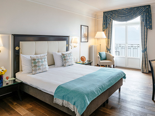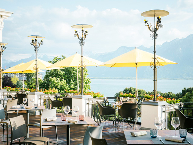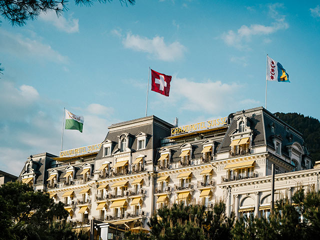 モントルーの町の中心に位置するリゾートホテル。レマン湖を望む湖畔に佇み、お部屋からは朝日や夕日に照らされるレマン湖の美しい景観をご覧いただきながらゆったりとお過ごしいただけます。画像/©Grand Hotel Swiss Majestic
