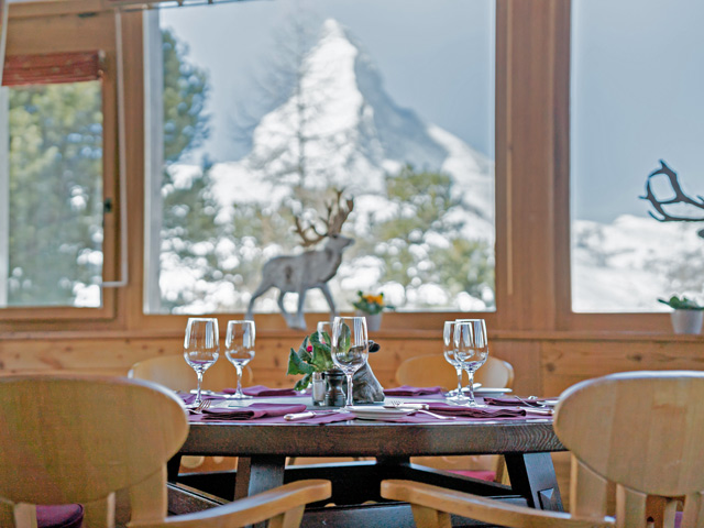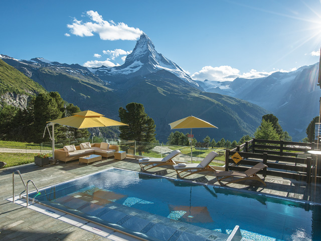 ゴルナーグラート展望台への登山電車の途中駅リッフェルアルプにあるデラックスリゾートホテルです。標高2222mの高さに位置しているため、麓のツェルマットよりもさらに迫力あるマッターホルンの眺めをお楽しみいただけます。フリータイムにはホテルのスパもお楽しみいただけます(料金別途)。