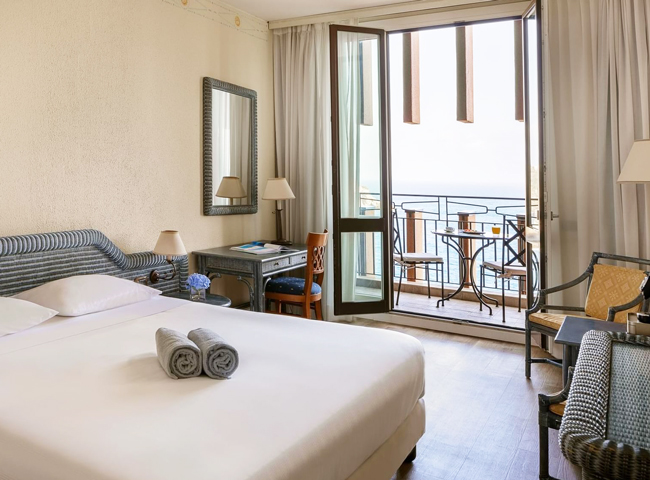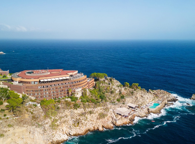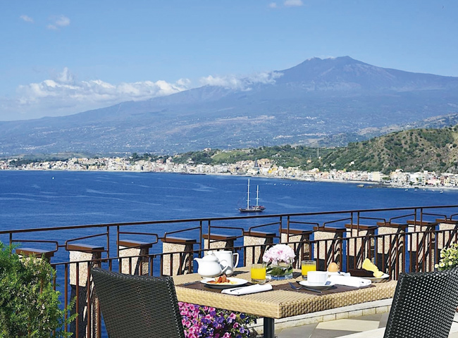 映画の舞台になったことでも有名なタオルミナの美しい海岸線に位置するデラックスホテル。テラスからは世界遺産に登録されている雄大なエトナ山もご覧いただけます。 写真は©UNAHOTELS Capotaormin