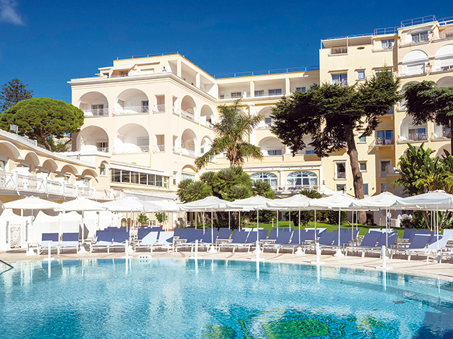 カプリ島の中心であるカプリ地区に佇むデラックスホテル。19世紀中頃からの歴史を持ち、かつてヘミングウェイやサルトルなど多くの著名人も滞在したカプリ島を代表するホテルの1つです。フリータイムにも便利なロケーションです。