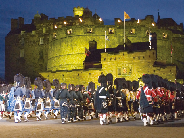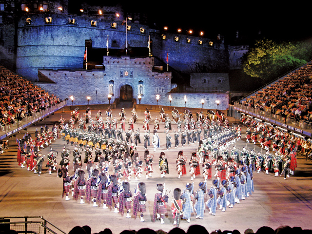 エジンバラ城を舞台に繰り広げられる迫力の軍楽隊の行進、響き渡るバグパイプ、光と花火が織りなす演出はまさに圧巻です。