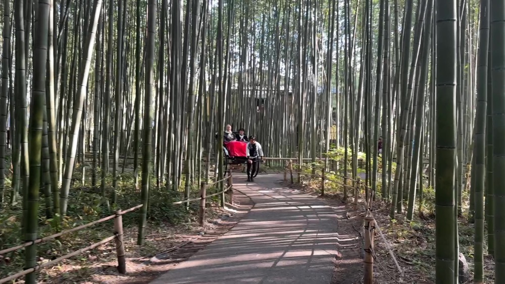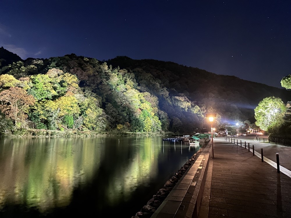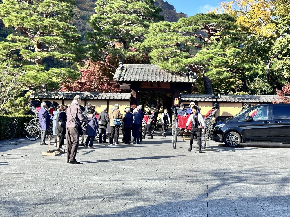 人力車に乗って朝の嵐山散策。太陽に照らされ赤色に輝く風景の中、それぞれの車夫さんと楽しい時間を過ごしてらっしゃいました。