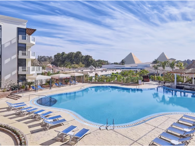 ギザのピラミッドから直線距離でわずか3kmの距離に位置するデラックスホテルです。プールサイドやお部屋のバルコニーから、ピラミッドをお楽しみいただけます。