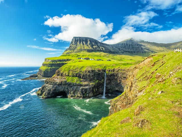 デンマーク自治領であり、本土から約1300km離れた北大西洋に浮かぶ18の島々からなるフェロー諸島をめぐる新コース。断崖絶壁と草原が織りなす原風景、海に落ちる滝や浮かぶように見える湖など、 絶景の宝庫へトースハウンに4連泊するゆとりの日程でご案内します。