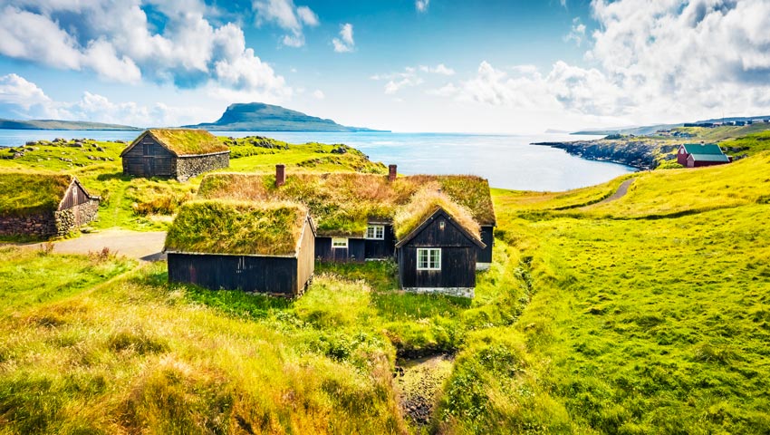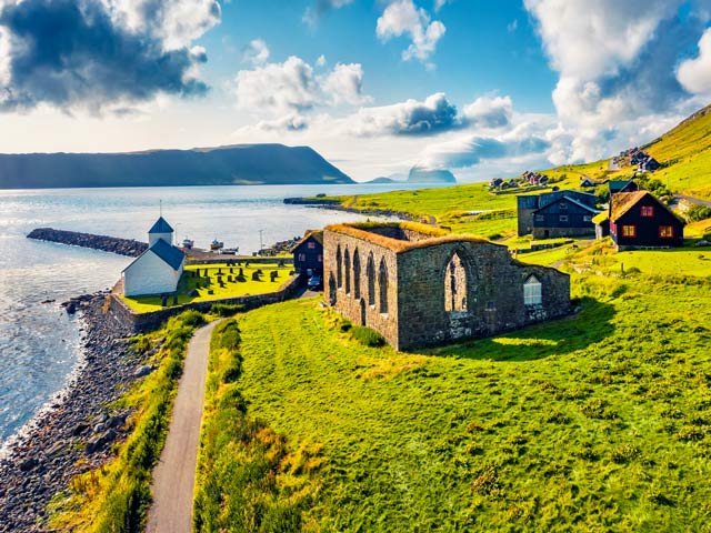 大西洋航路の要衝として栄えたフェロー諸島には、今もヴァイキングの息遣いが残ります。その中心地として知られ、中世の教会跡や古い木造家屋が往時の暮らしを静かに語りかける小さな村チュシチュボアを訪れます。荒々しい自然とともに生きてきた人々の営みが色濃く残るフェロー諸島の歴史と文化の深さをご体感ください。